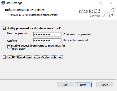 여기가 중요한 곳입니다. 루트 패스워드와 UTF 변환 및 외부 루트 접속 허용을 설정하는 곳입니다.