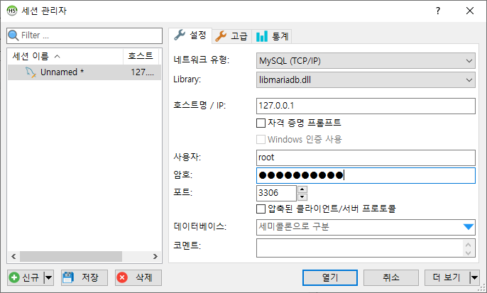 아까 마리아 DB를 설치할 때 입력했던 비밀번호를 입력해 줍니다. 저는 로컬호스트 즉, 같은 컴퓨터에 마리아 DB 서버를 설치했기 때문에