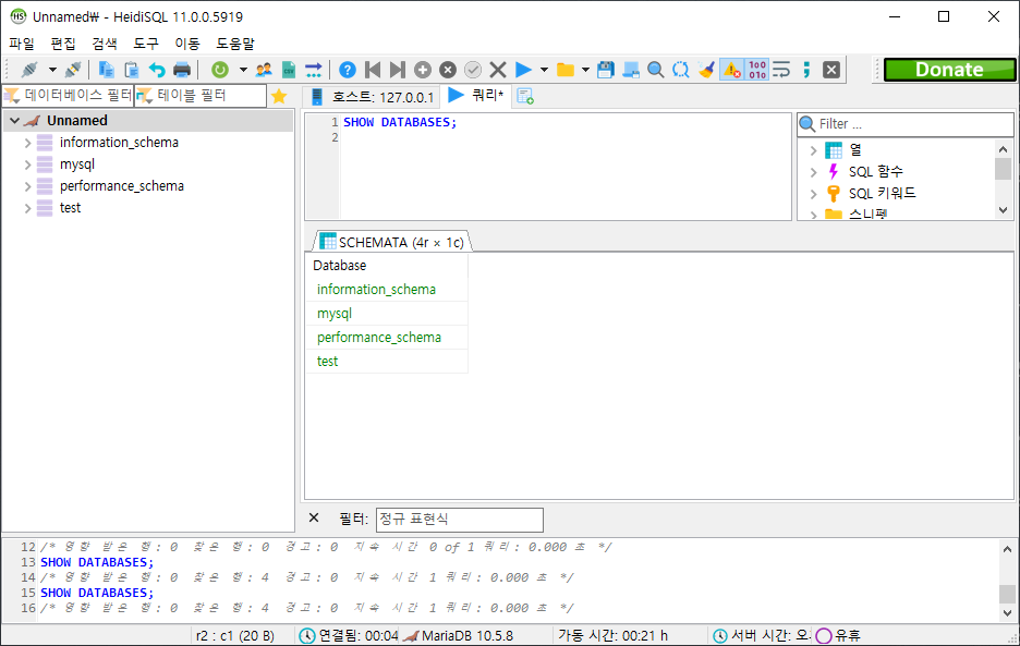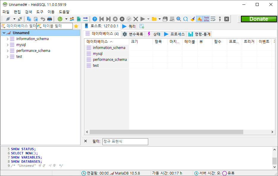 이렇게 입력하면 현재 데이터베이스의 목록이 나오는 것을 보실 수 있습니다.