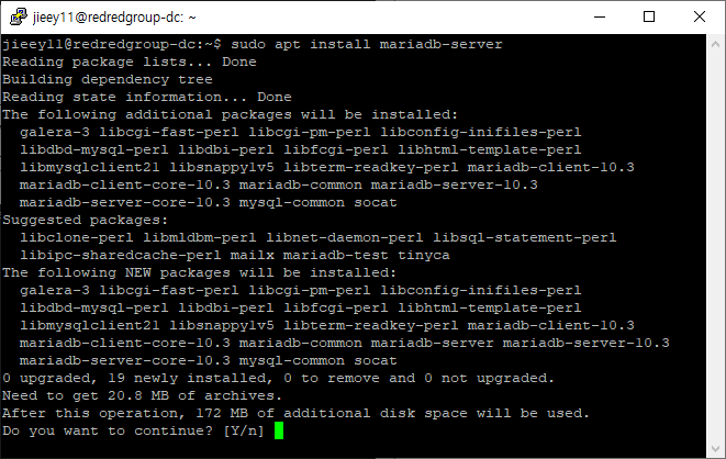 Y를눌러 계속 진행해 줍니다. (sudo apt install mariadb-server -y -< y를 붙이면 동의없이 바로 설치됩니다.)