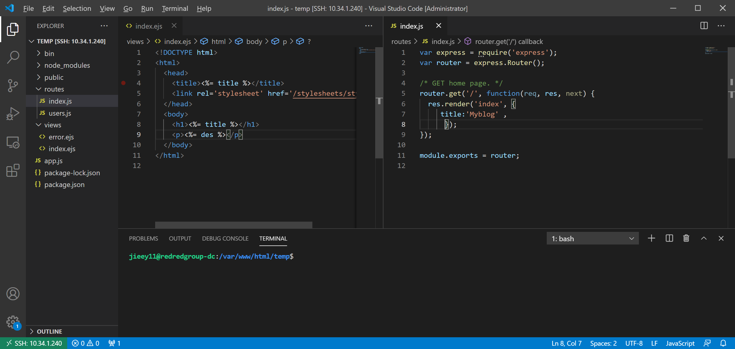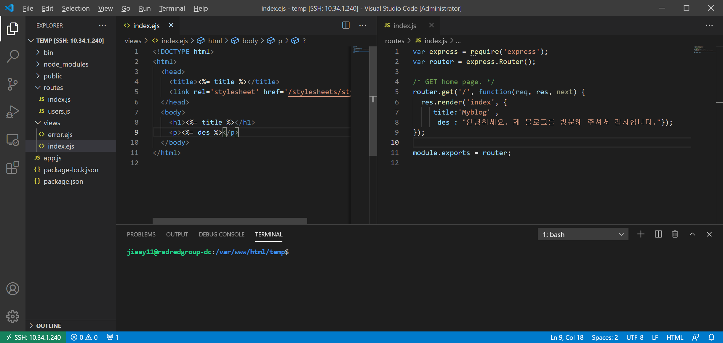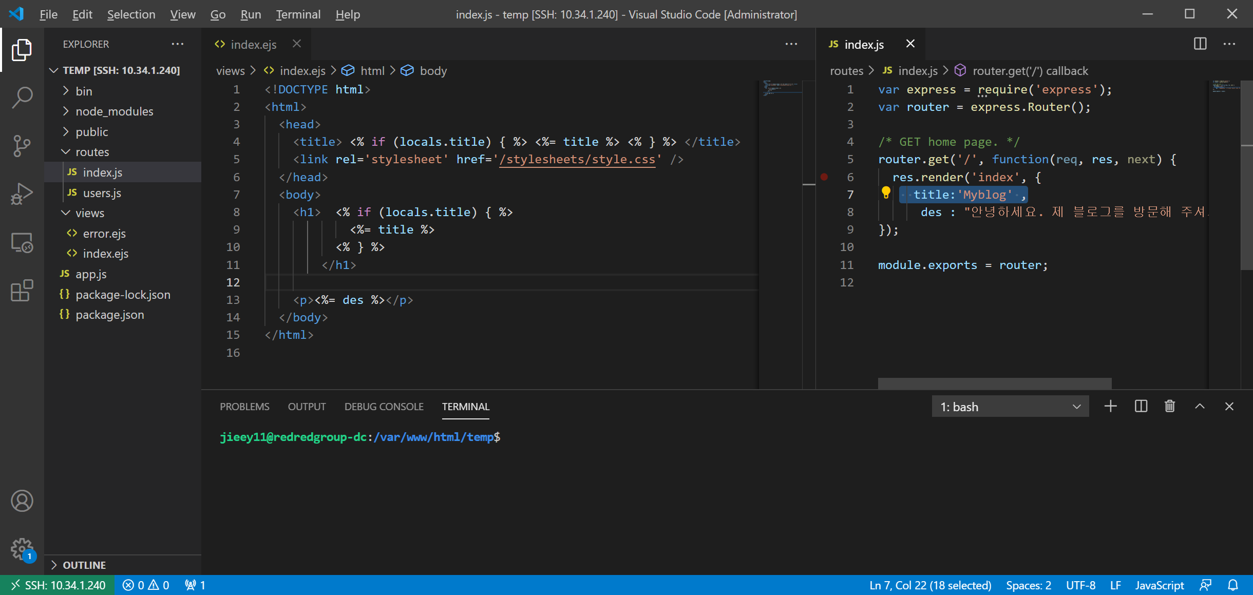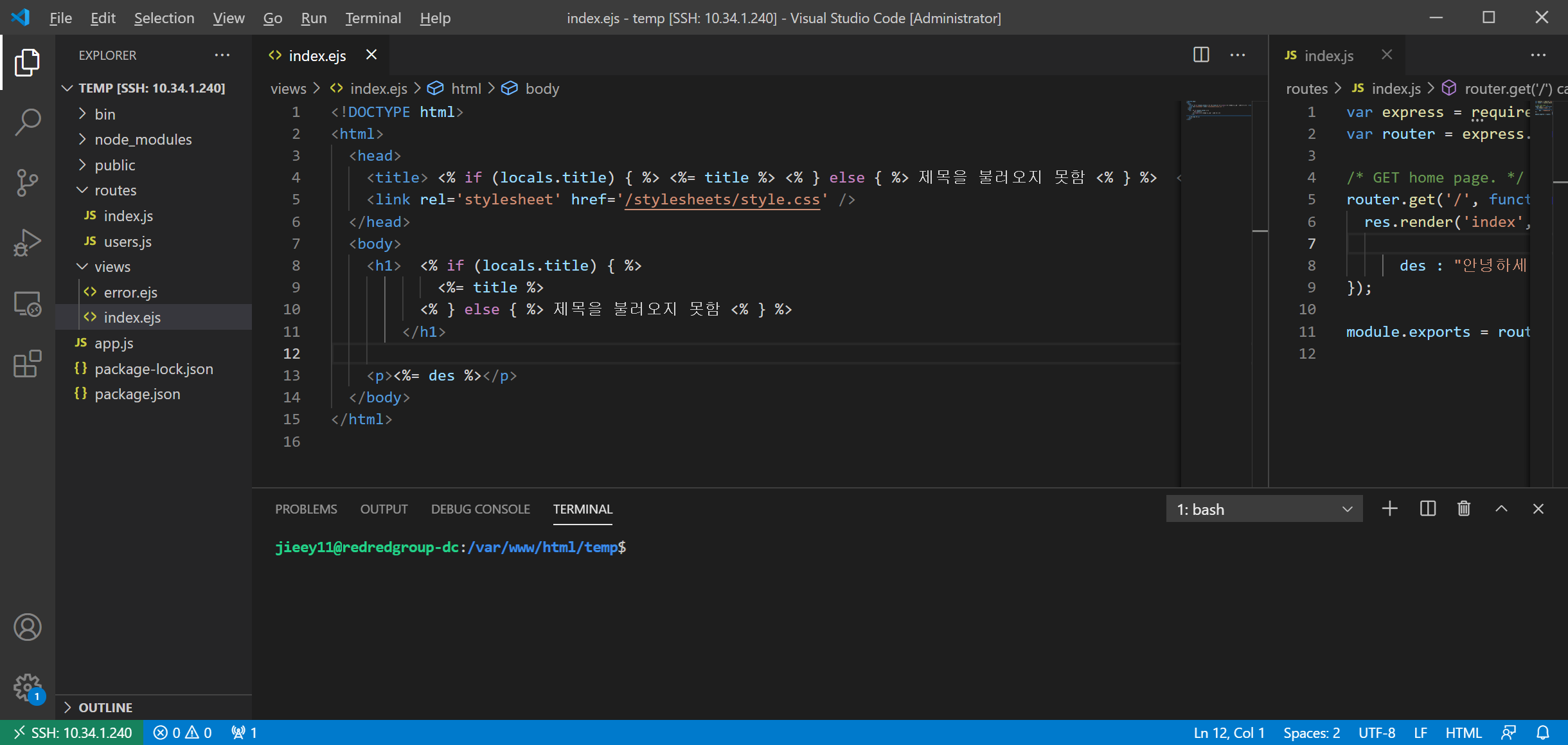 정상적으로 잘 표시됩니다. 이제 한번 서버측 (오른쪽 index.js) 에서 title 변수를 지워보겠습니다.