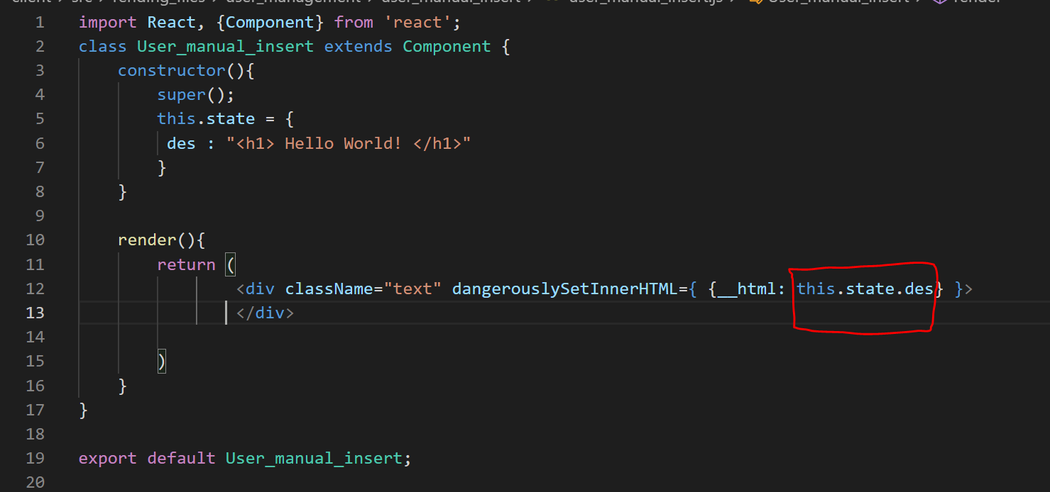 이 문법을 적용하고 기존에 있던 코드를 삭제하였습니다. 그리고 dangerouslySetInnerHTML={?{__html: this.state.des?}?} 로 변경하였습니다.